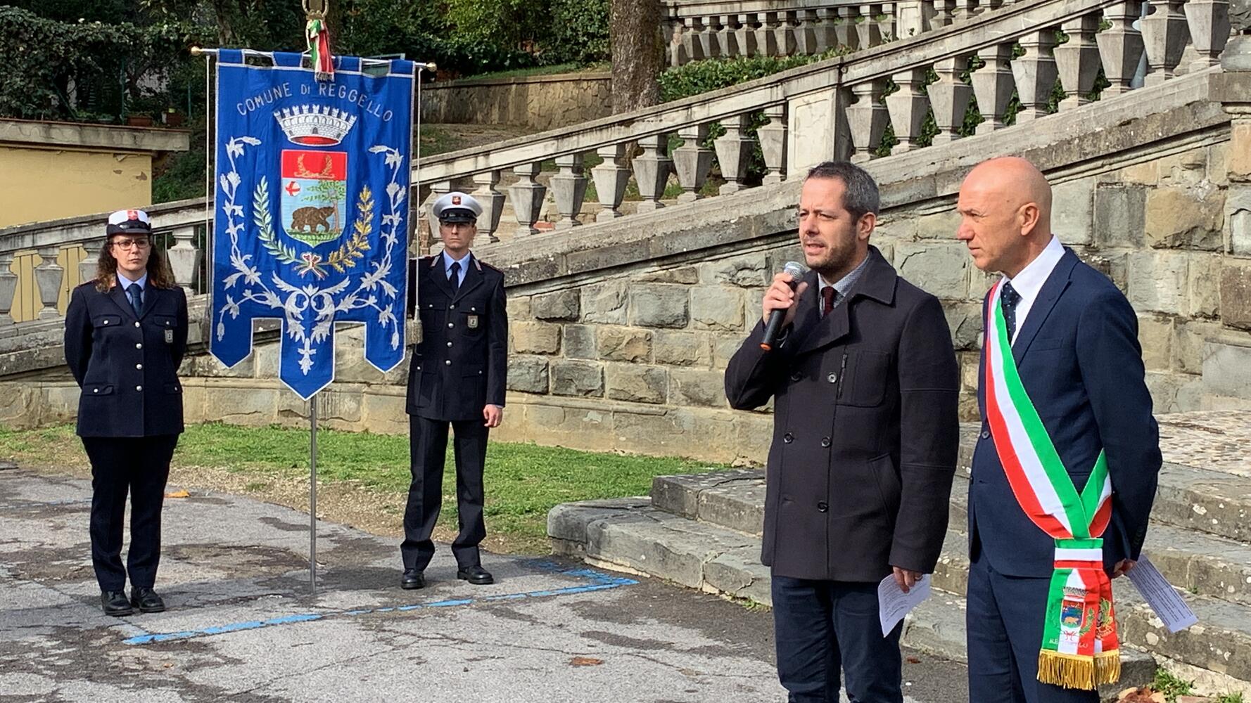 Celebrazione e deposizione di corone d'alloro ai monumenti ai caduti posti nel Loggiato del Comune di Reggello, in Piazza Matteotti e in piazza IV Novembre, alla presenza delle Autorità e dei rappresentanti delle Associazioni Combattentistiche. L'accompagnamento musicale è stato svolto dal gruppo SaràBanda dell’Istituto Comprensivo.
