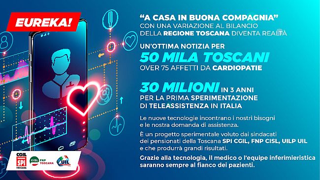 La scorsa settimana il presidente della Regione Toscana ha incontrato i Segretari delle organizzazioni sindacali dei pensionati toscani per informarli che il Consiglio regionale in sede di approvazione della Legge di bilancio ha approvato il finanziamento del progetto “A casa in buona compagnia” con 30 milioni di euro nel triennio 2020/2022. Il progetto sperimentale di tele assistenza interesserà 50 mila toscani affetti da cardiopatie.