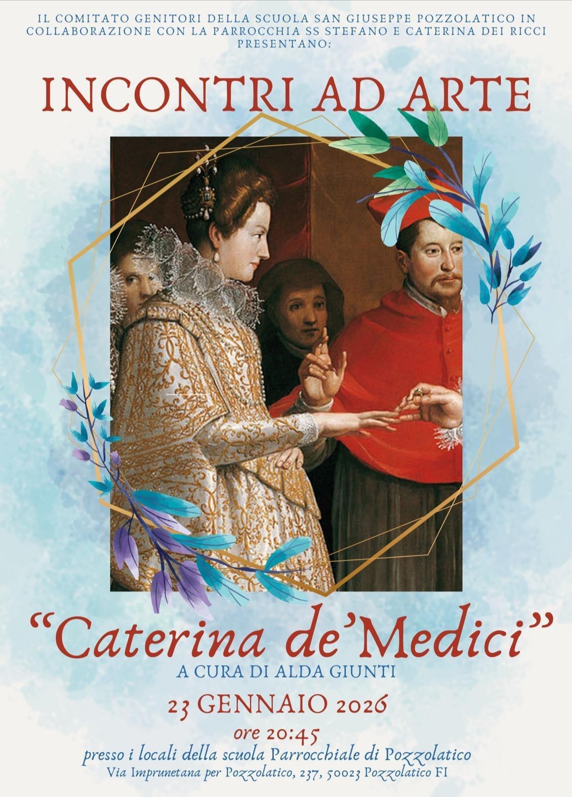 POZZOLATICO (IMPRUNETA) - Proseguono a Pozzolatico gli appuntamenti culturali della serie "Incontri ad arte", a cura di Alda Giunti e promossi dal Comitato genitori (composto da ex allievi , genitori di allievi, di ex allievi e simpatizzanti in generale) di cui è presidente Elena Brilli Perini: venerdì 23 gennaio presso i locali della Scuola parrocchiale si parlerà di Caterina de' Medici, uno dei personaggi che hanno fatto la storia d'Europa. Nata a Firenze il 13 aprile 1519, fu regina consorte di Francia, come moglie di Enrico II, dal 1547 al 1559, reggente dal 1560 al 1563.