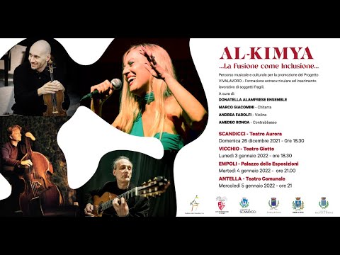 Donatella Alamprese Ensemble: Marco Giacomini alla chitarra; Andrea Farolfi al violino; Amedeo Ronga al contrabbasso."A Natale non ci dimentichiamo dei più fragili - è l'invito della Fondazione Franceschini - Con il supporto della Città Metropolitana, dei partners (Fondazione Caritas, Diaconia Valdese, Cna, Confartigianato, Confindustria) e dei Comuni di Scandicci, Vicchio, Empoli e Bagno a Ripoli, la Fondazione Guido Franceschini Ets ha affidato alla musica e allo spettacolo Al-Kimya il compito di sostenere il progetto Vivalavoro, mirato alla formazione extracurriculare e all'inserimento lavorativo di soggetti fragili".