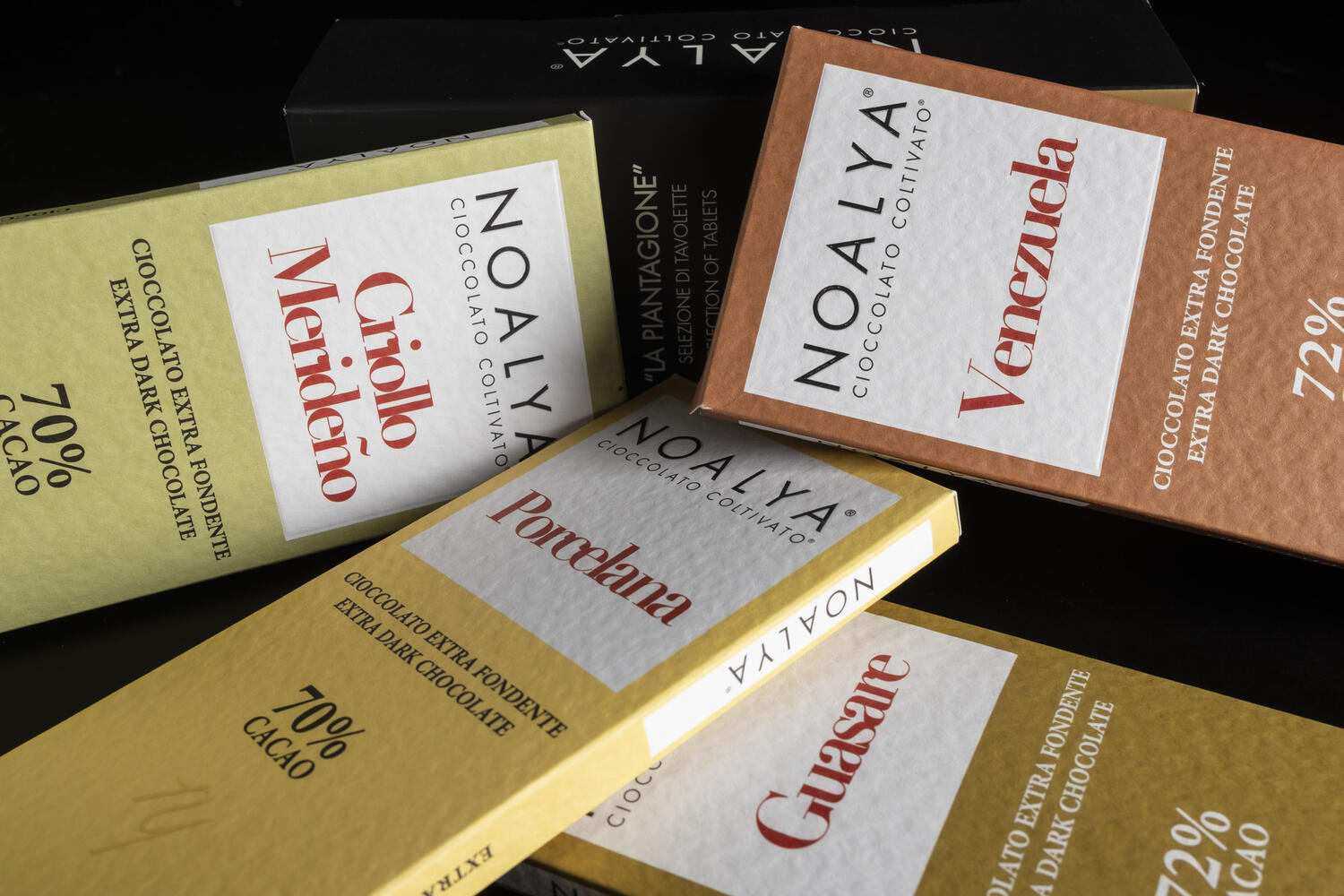 Il consumatore può scegliere tra 33 tavolette. Il primo pensiero va ai monorigine Venezuela delle varietà Criollo con gli ecotipi Guasare, Merideño e Porcelana provenienti dalla piantagione di proprietà. Noalya produce tavolette di cacao singola origine Colombia, Guatemala, Trinidad, Ecuador, Nicaragua, Repubblica Dominicana, Jamaica, Cuba, Honduras, Grenada, Brasile, Perù, Costa Rica, Papua Nuova Guinea, Madagascar, Tanzania, Vietnam, Java. Per ogni cioccolato è possibile apprezzare le differenze di profumi, aromi e gusti dei vari territori di provenienza. Inoltre troviamo i blend numerati, come il 309, extra fondente con sentori di mora e liquirizia o il 204, al latte, con note di vaniglia e burro salato e le due tipologie di cioccolato bianco. Un vero ventaglio di sapori diversi, da gustare in purezza oppure da abbinare a distillati, vini, sigari in un gioco infinito di sensazioni voluttuose.