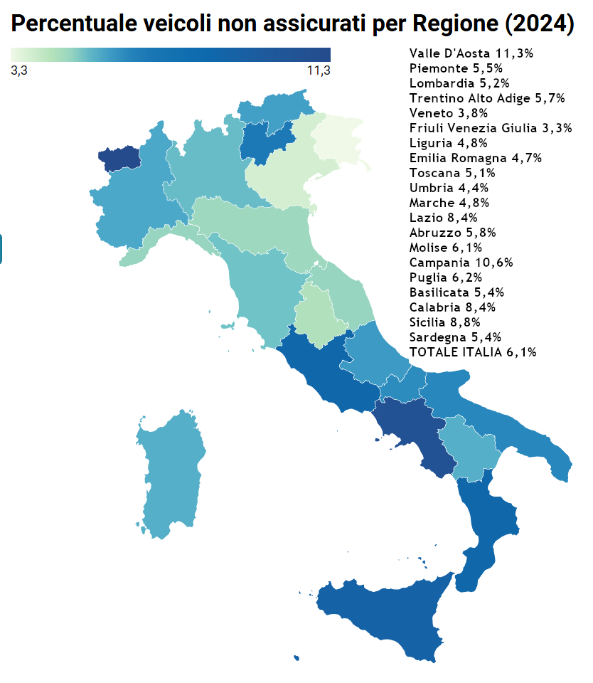 L'analisi dei dati 2022-2024 mostra una crescita su tutto il territorio nazionale. Mentre il Sud Italia registra un aumento più contenuto del 3,5% e il Centro Italia un incremento del 10,7%, il Nord Italia evidenzia l'aumento più drastico, con un sorprendente +24,8% di veicoli non assicurati rispetto al 2022.