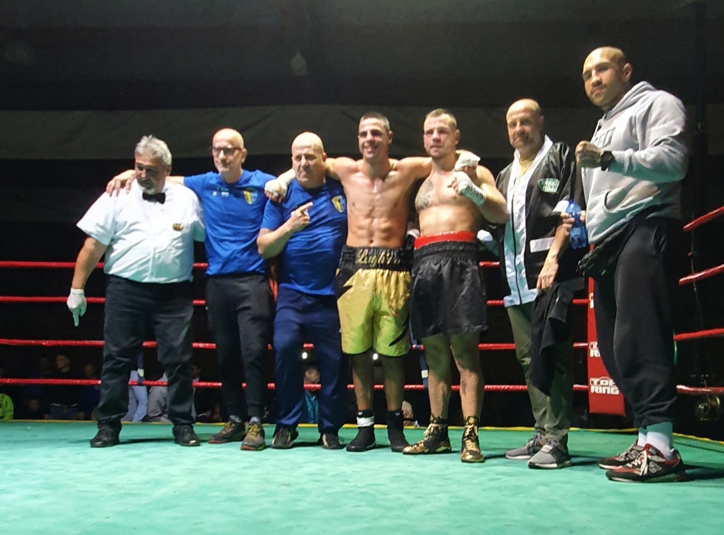 Il match finisce con la vittoria ai punti, gli applausi del pubblico e la grande sportività dei due angoli che posano insieme per uno scatto.