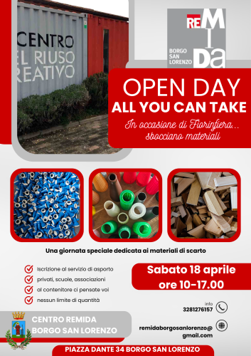E poi le attività di ReMida, che sabato 18 aprile apre le porte con un evento speciale dedicato al riuso creativo: “Sbocciano Materiali”! Per questa giornata sarà possibile partecipare con la formula “All You Can Take”: tutti i materiali disponibili potranno essere portati via senza limiti di contenitori, basta iscriversi al servizio di asporto o portare la tessera per chi è già iscritto, portando da casa il tuo contenitore e riempiendolo fin che si vuole, occasione unica per dare nuova vita ai materiali e lasciar fiorire la creatività.