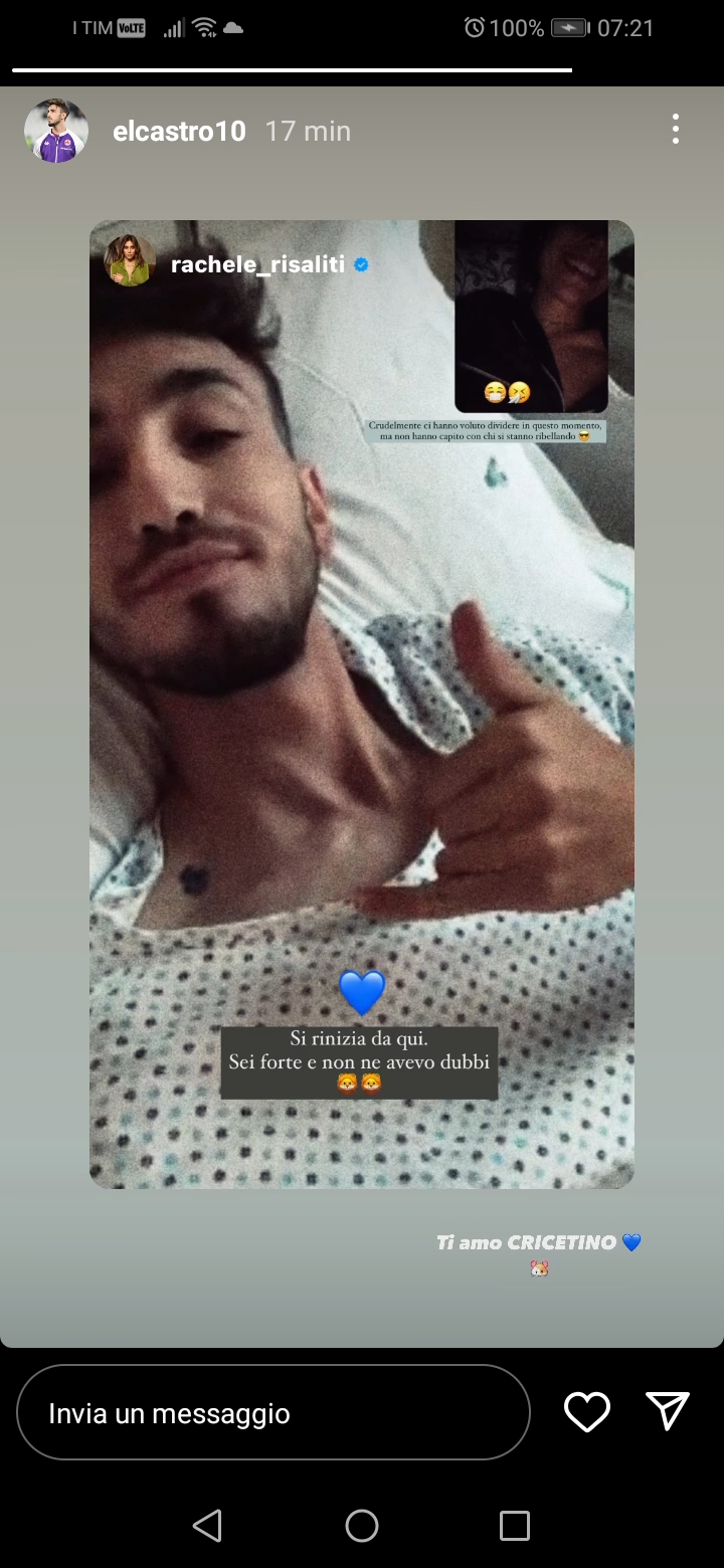 In una storia Instagram, la fidanzata Rachele Risaliti incoraggia così l'amato: "Si rinizia da qui. Sei forte e non ne avevo dubbi".