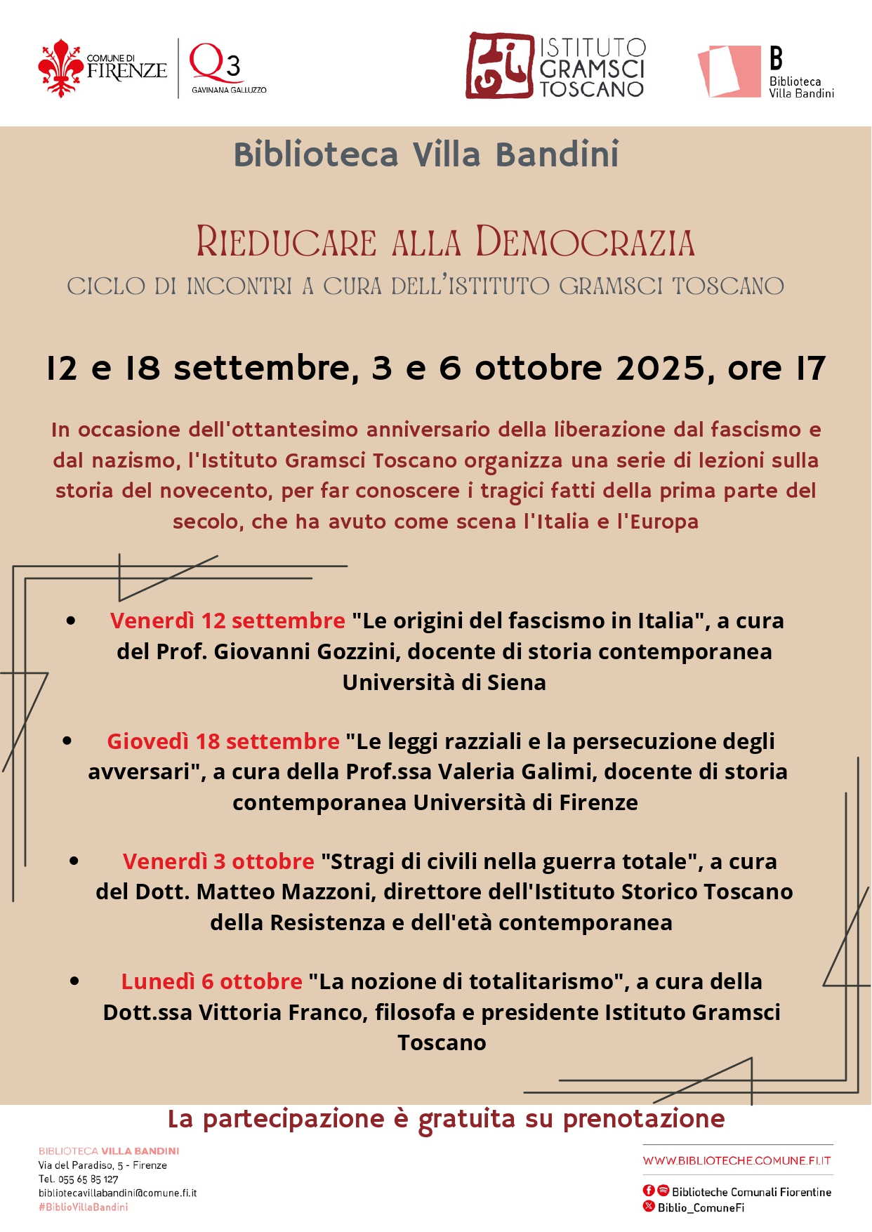 1. Le origini del fascismo in Italia, Giovanni Gozzini, docente di storia contemporanea Università Siena, 12 settembre (sono previsti saluti istituzionali)2. Le leggi razziali e la persecuzione degli avversari, Valeria Galimi, docente di storia contemporanea Università Firenze, 18 settembre3. Stragi di civili nella guerra totale, Matteo Mazzoni, direttore Istituto Storico Toscano della Resistenza e dell’Età contemporanea, 3 ottobre