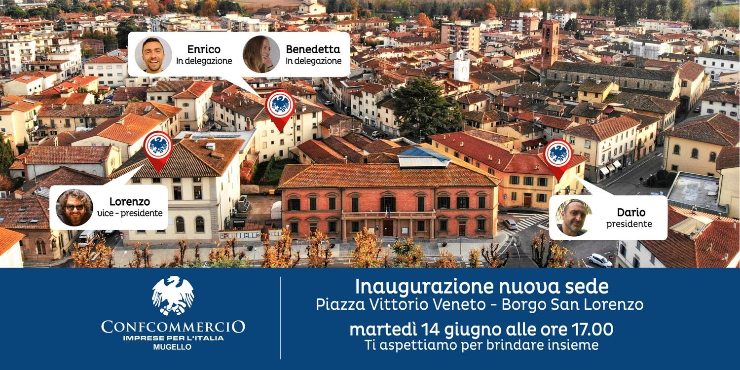 Il taglio del nastro per i nuovi uffici si terrà martedì 14 giugno 2022, alle ore 17.00 in piazza Vittorio Veneto, angolo via Trieste. Per l’occasione, a cui sono state invitate tutte le autorità locali, saranno presenti il sindaco di Borgo San Lorenzo Paolo Omoboni e il presidente dell’Unione dei Comuni del Mugello Stefano Passiatore, insieme ai vertici della Confcommercio: il presidente regionale e provinciale Aldo Cursano, il direttore generale Franco Marinoni, il presidente del Mugello Dario Cenci e il responsabile di delegazione Enrico Paoli.