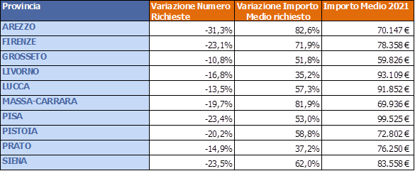 Per quanto riguarda l’importo mediamente richiesto, invece, il valore più consistente è quello registrato a Pisa, con 99.525 Euro, e a Livorno, con 93.109 Euro, contro i 78.358 Euro di Firenze. Malgrado una crescita rispetto alla rilevazione del 2020, solo Grosseto resta sotto i 60.000 Euro di media.