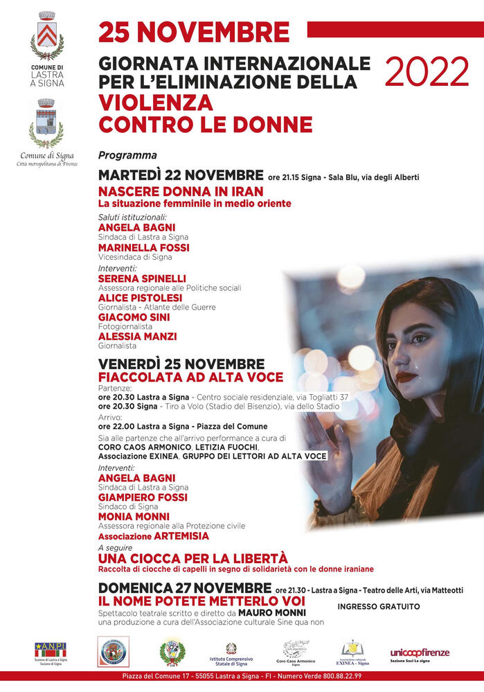 Venerdì 25 novembre si terrà la tradizionale fiaccolata con partenza alle 20.30 da Lastra a Signa, Centro sociale Residenziale di via Togliatti, e sempre alle 20.30 da Signa dal Tiro a Volo in via dello Stadio con arrivo, per entrambi i cortei, in piazza del Comune-Lastra a Signa. Sia alle partenze che all’arrivo performance a cura di caos Armonico, Letizia Fuochi, Associazione Exinea, Gruppo Lettori ad Alta Voce.