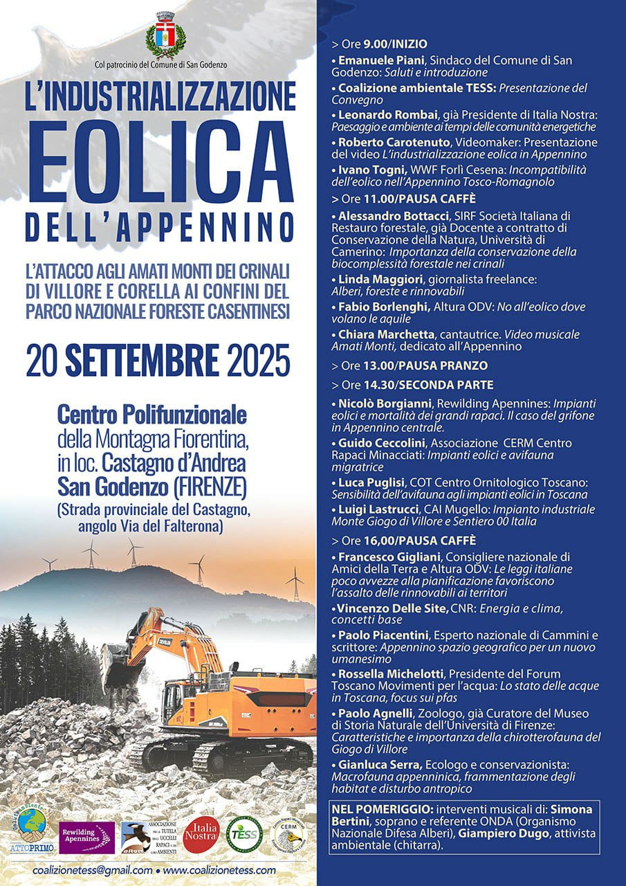 Sabato 20 settembre 2025 dalle ore 9:00 il convegno L'industrializzazione eolica dell'Appennino. L'attacco agli amati monti dei crinali di Villore e Corella ai confini del Parco Nazionale Foreste Casentinesi a Castagno d'Andrea, ospitato nel Centro Polifunzionale della Montagna Fiorentina, Strada provinciale del Castagno, angolo via del Falterona. Il convegno avrà come tema le criticità dell'eolico in Appennino e le alternative da perseguire per una reale transizione ecologica.