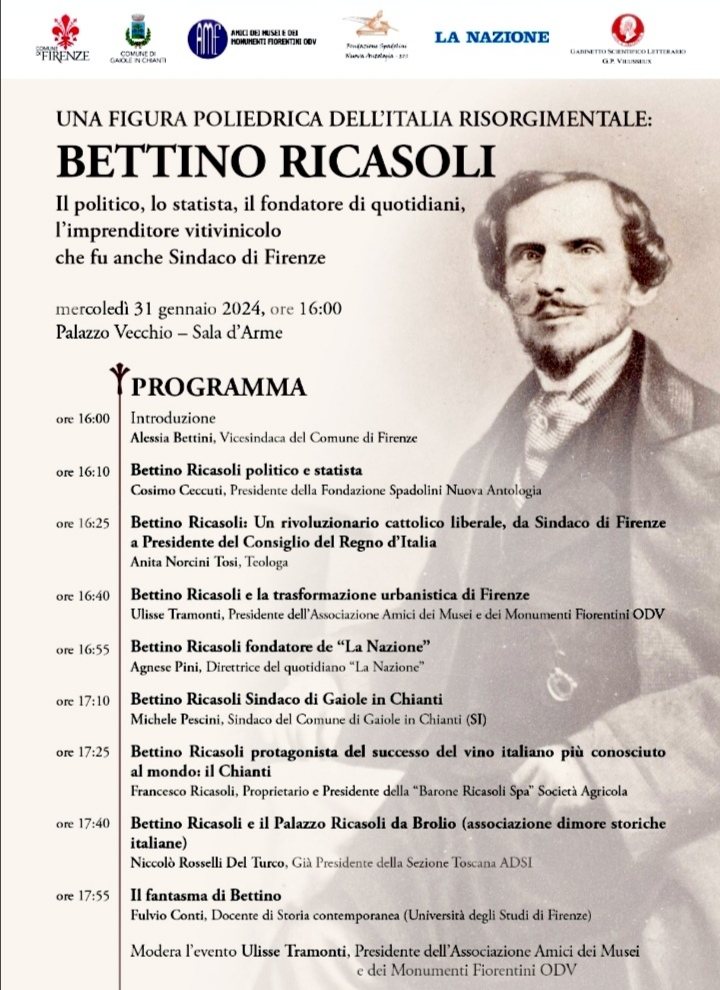Convegno su Bettino Ricasoli in Palazzo Vecchio mercoledì 31 gennaio (ore 16, Sala d'Arme). Una figura fondamentale del Risorgimento italiano, il fiorentino Ricasoli, politico, statista, fondatore di quotidiani, imprenditore vitivinicolo nonché sindaco di Firenze.