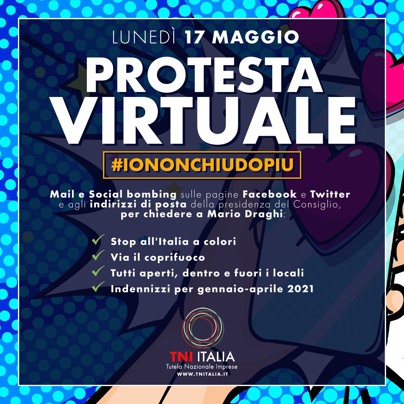 In attesa della cabina di regia sulle riaperture prevista per lunedì, Tni Italia ha lanciato un'iniziativa di protesta virtuale: mail e social bombing sulle pagine Facebook e Twitter e agli indirizzi di posta elettronica della presidenza del Consiglio, sotto l'hashtag #iononchiudopiu, per chiedere al premier Mario Draghi di tenere conto delle richieste che arrivano dalle imprese del mondo Horeca.