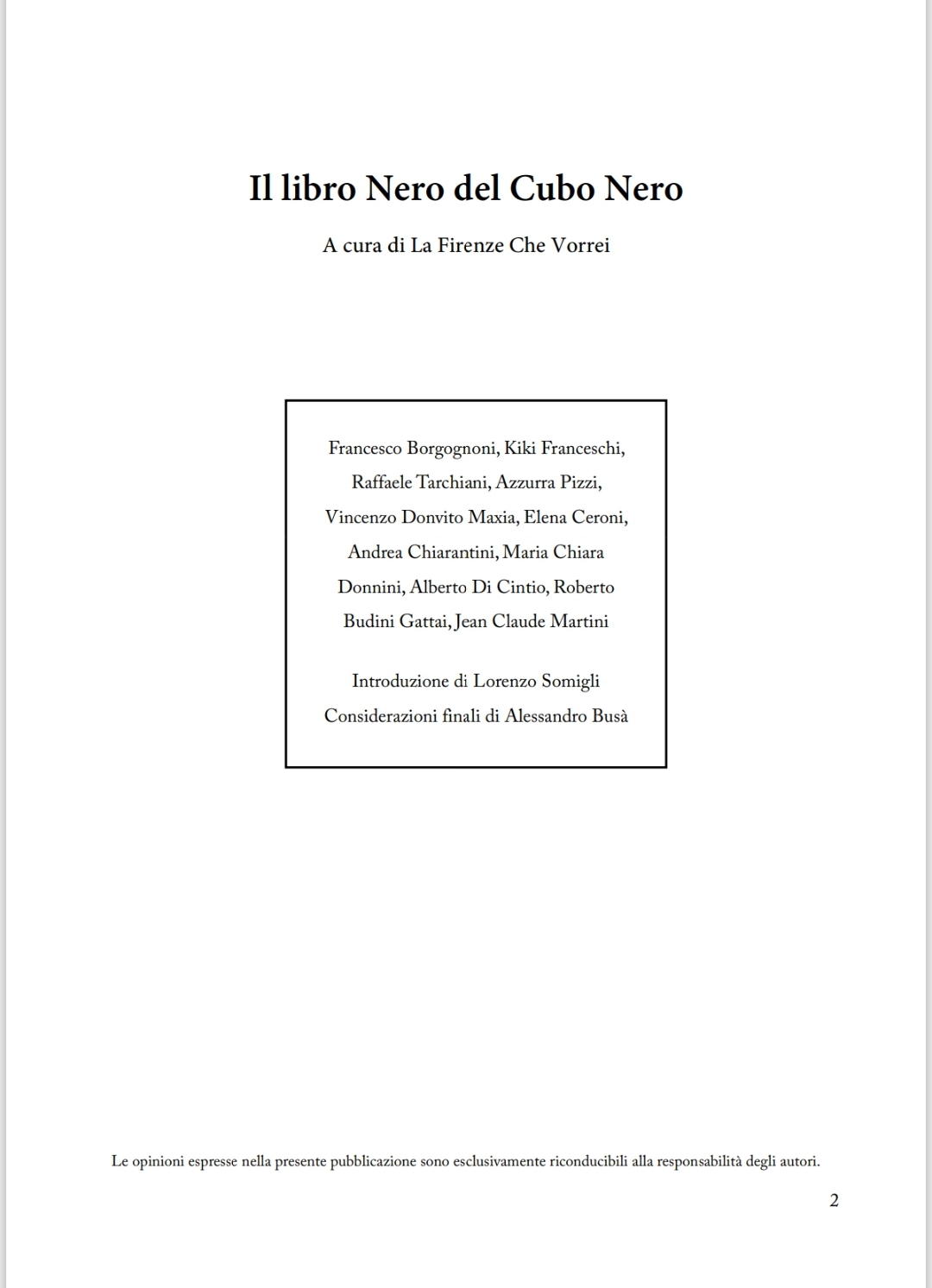 Il volumetto si apre con il "S'i' fosse cubo annerirei Firenze" di Lorenzo Somigli, direttore de 'La Firenze che vorrei', e termina con le riflessioni di Alessandro Busà che suggerisce "un intervento correttivo" sul Cubo, "mirato a ripristinare il tono dorato iniziale, e possibilmente a ridurne l'altezza", ciò "non equivarrebbe a un'abiura della contemporaneità, bensì a un'opportunità per tentare di ricucire un qualche minimo dialogo con il genius loci fiorentino".