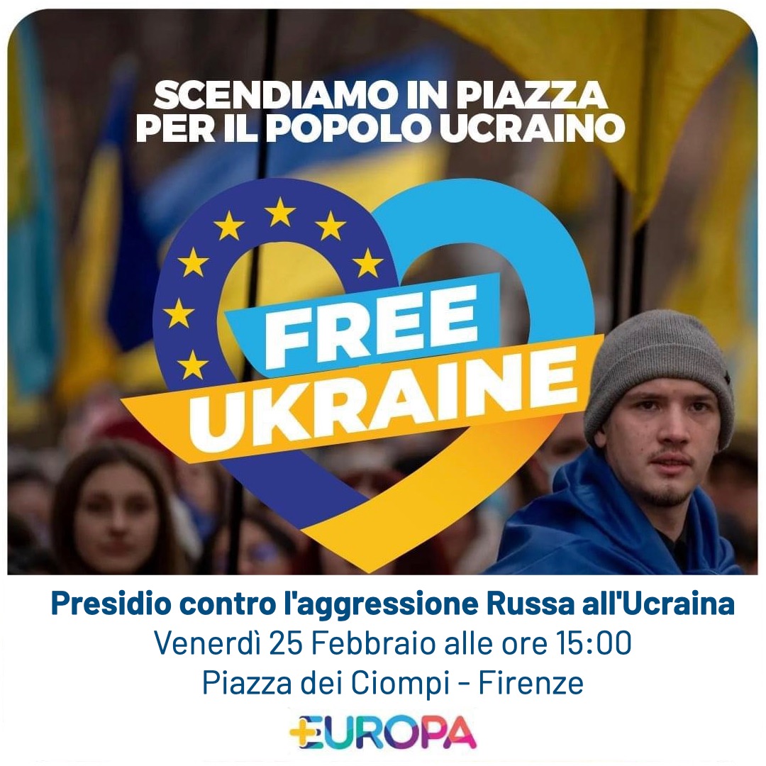 Tra le varie iniziative, domani denerdì 25 febbraio, a partire dalle 15.00, il gruppo +Europa Firenze ha organizzato un presidio in piazza dei Ciompi per condannare la violazione del diritto internazionale, della sovranità e dell'integrità territoriale dell'Ucraina da parte della Russia di Vladimir Putin.