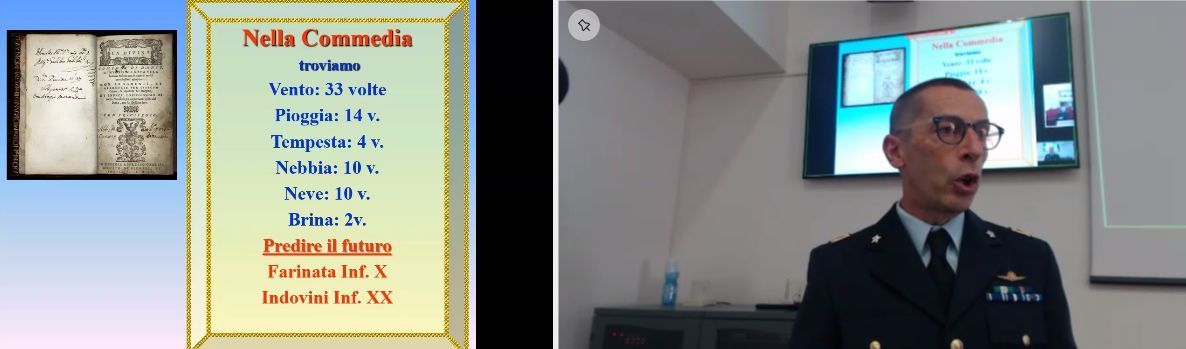 Gli aspetti meteorologici nella Divina Commedia e l'evoluzione della fisica dell’atmosfera dai tempi di Dante a oggi, sono al centro della conferenza che tiene stamani il tenente colonnello Alessandro Fuccello agli allievi delle quinte classi della Scuola militare aeronautica Giulio Douhet di Firenze.