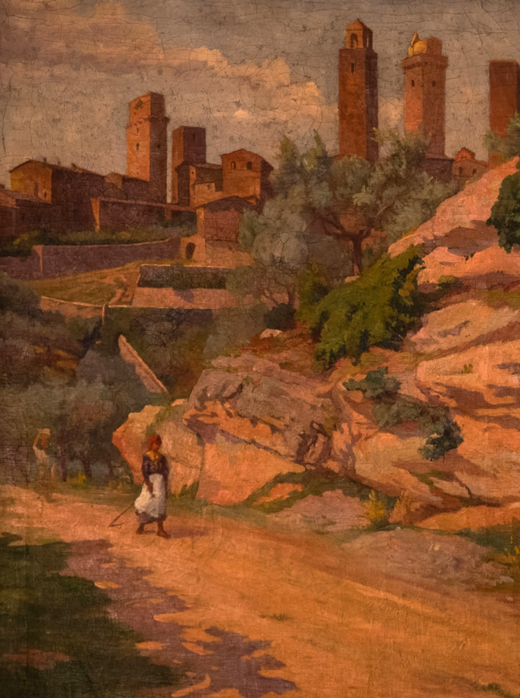 Si celebra così un pittore che ha tratto ispirazione dalla Toscana e in particolare dalle aree senesi e fiorentine. La sua opera è anche una testimonianza di una Firenze “com'era" (alla quale il Museo comunale dedicò un'intera saletta), con scorci di vie e di piazze andate distrutte o trasformate. Del resto in questa città aveva stabilito la sua dimora e fissato il suo studio in via della Vigna Nuova. Non mancano altre affascinanti ispirazioni: la cittadina di San Gimignano con i vicoli, le torri e gli uliveti.