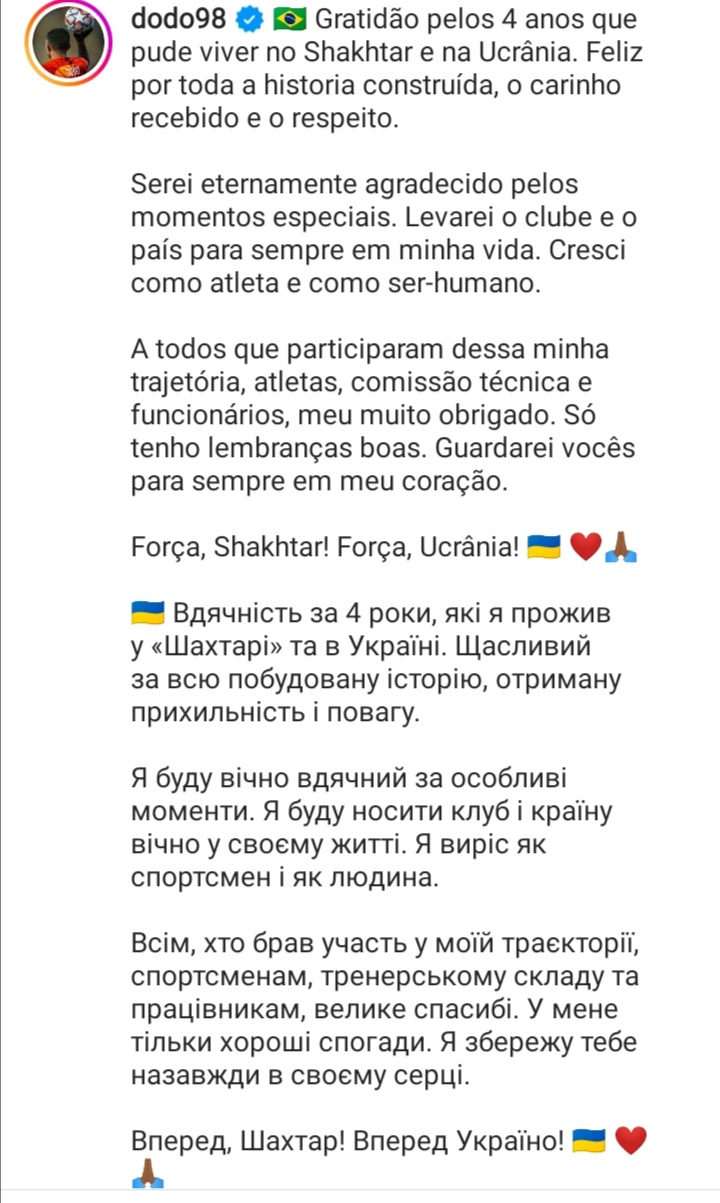 Nel post social, Dodò sottolinea in portoghese e ucraino l'importanza di questi 4 anni anche per la sua crescita come uomo.