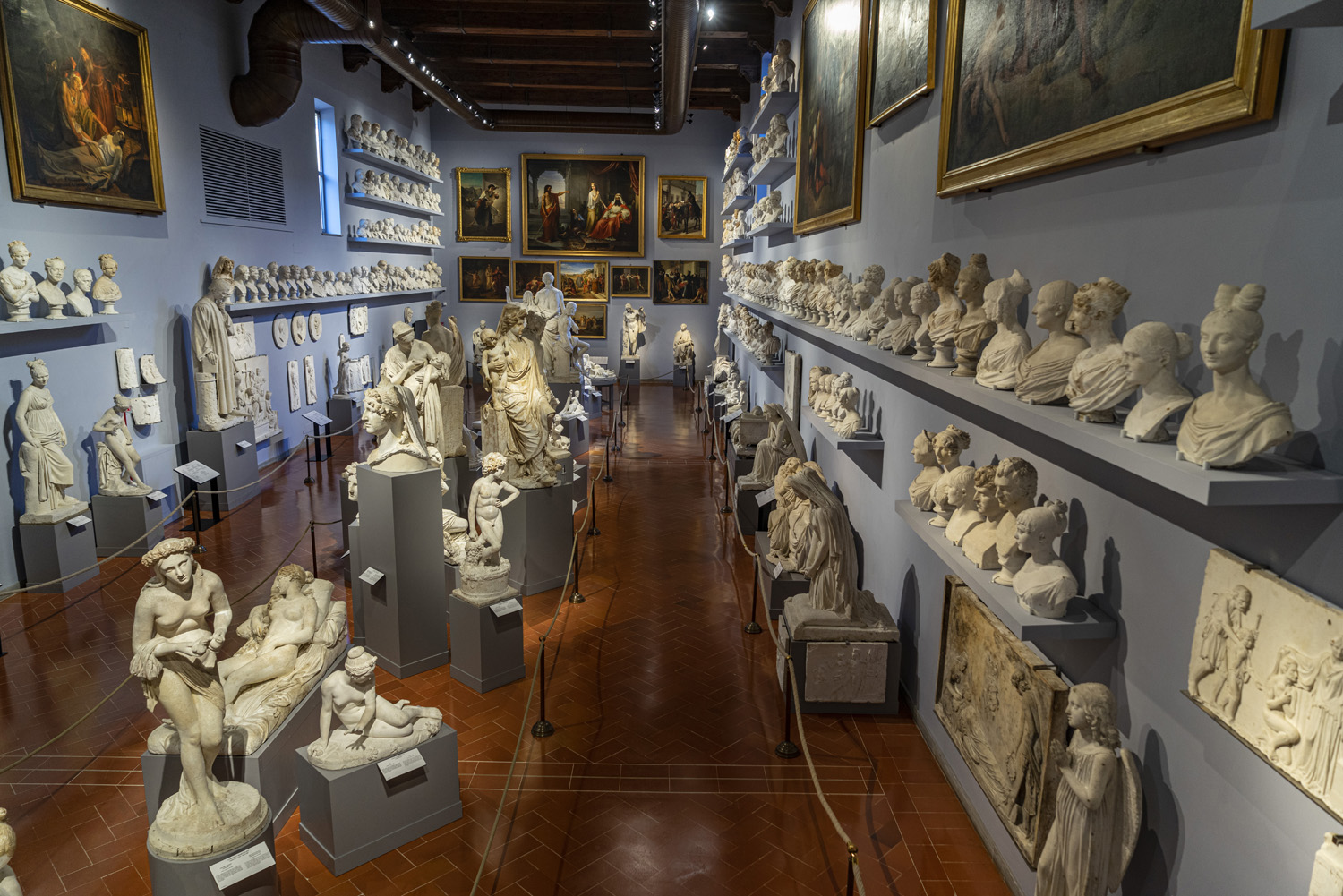La Gipsoteca è un vero gioiello, un’ambiente sorprendente che i visitatori non si aspetterebbero di trovare. Il monumentale salone è un luogo di grande fascino che ricrea idealmente lo studio di Bartolini, tra i più importanti scultori italiani dell’800; riunisce gran parte dei gessi da lui realizzati: oltre 400, tra busti, bassorilievi, sculture monumentali, modelli originali, due busti in marmo raffiguranti il musicista Niccolini e Napoleone Bonaparte (recentissima acquisizione), insieme ad una raccolta di dipinti di maestri ottocenteschi che hanno studiato o insegnato all’Accademia di Belle Arti.