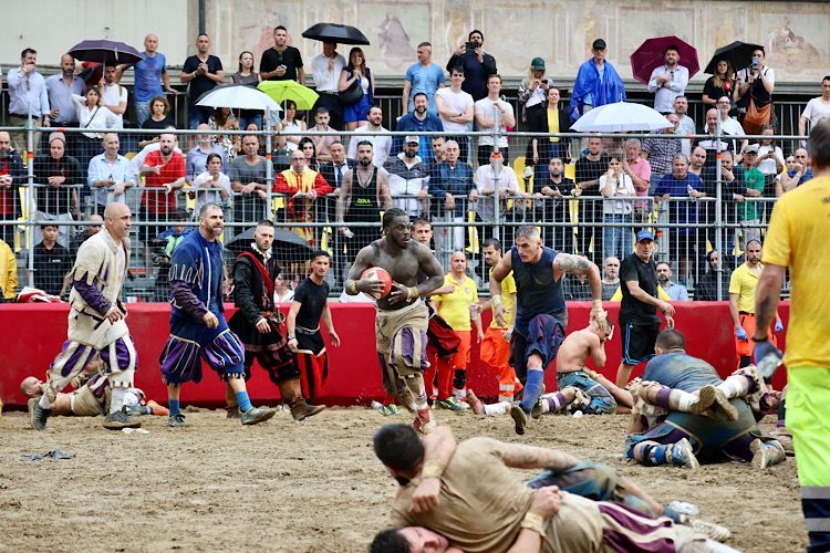 FIRENZE- Si temeva la pioggia e l’acqua è arrivata puntuale quasi all’inizio della partita. La tradizionale sfida dei campioni Azzurri-Bianchi si apre con il sabbione bagnato. All’inizio si tratta di goccioline fitte, che mettono in difficoltà soltanto i figuranti del corteo, con costumi appesantiti e armi a rischio ruggine.