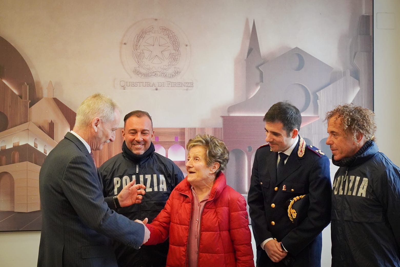 Questa mattina la signora, vittima nei giorni scorsi della truffa a Sesto Fiorentino e alla quale sono stati restituiti tutti i suoi averi dai Falchi della Squadra Mobile di Firenze, ha voluto personalmente ringraziare la Polizia di Stato.
