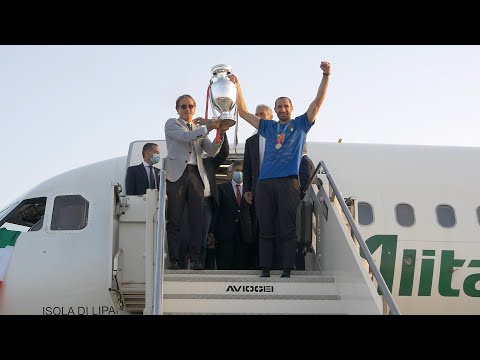 Le immagini del ritorno della Nazionale dopo il trionfo ai calci di rigore sull'Inghilterra che ha permesso agli Azzurri di diventare Campioni d'Europa dopo 53 anni di assenza
