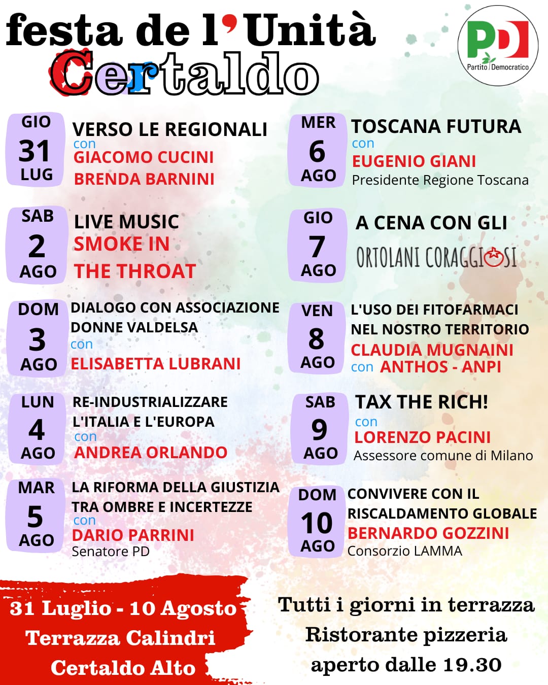 Venerdì 1 agosto parte la live music con la band WBR, sabato 2 agosto live music con Smoke in the thoath; domenica 3 incontro con Elisabetta Lubrani dell’associazione Donne Valdelsa, lunedì 4 agosto con Andrea Orlando, capogruppo Pd del Consiglio regionale della Liguria, già Ministro della Repubblica, si parlerà di “Reindustrializzazione-L’Italia e l’Europa”, martedì 5 agosto il senatore Dario Parrini parlerà della riforma della giustizia, mentre il 6 agosto sarà presente il presidente della Regione Eugenio Giani.