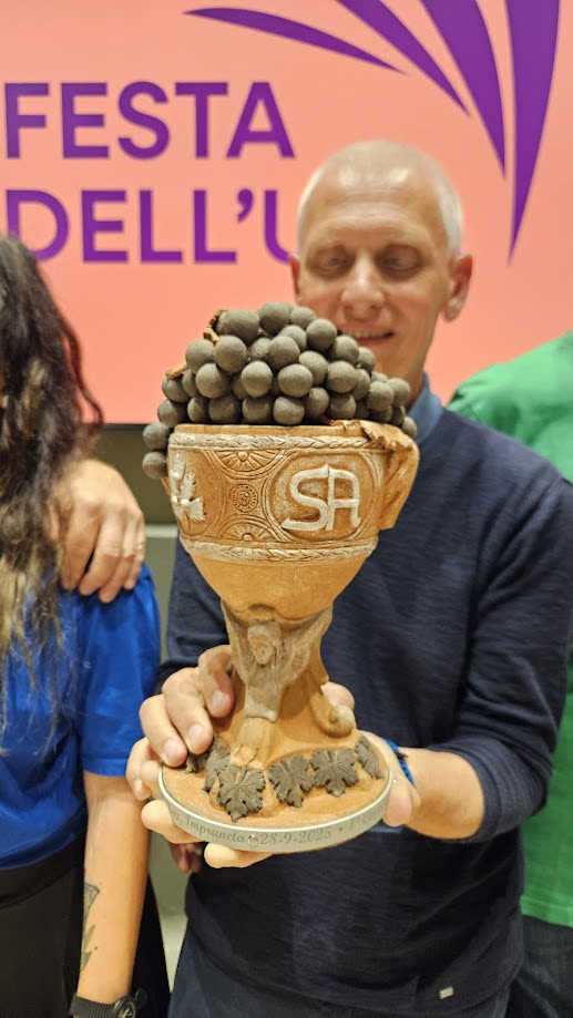 "Mi piace molto realizzare coppe: questa è la quarta che creo. Si tratta di un’opera dallo sviluppo contenuto ma molto curata nei dettagli. È colma di uva e rappresenta un omaggio simbolico alla tradizione. Sono presenti i simboli dei quattro rioni, mentre alla base due cariatidi alate sorreggono la coppa, evocando forza e libertà — proprio come la Festa dell’Uva. L’uva è femmina, la festa è femmina, e le cariatidi sono donne: figure che rappresentano il lavoro silenzioso ma fondamentale che sostiene tutto questo", ha dichiarato Antonella Andrei.