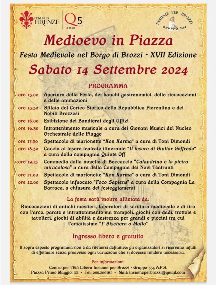 Sabato 14 settembre ritorna l’animazione medio-rinascimentale del borgo di Brozzi con un pomeriggio e una serata davvero coinvolgenti per tutti: animazioni, giochi antichi e varie attrazioni caratterizzeranno piazza I maggio e via di Brozzi.