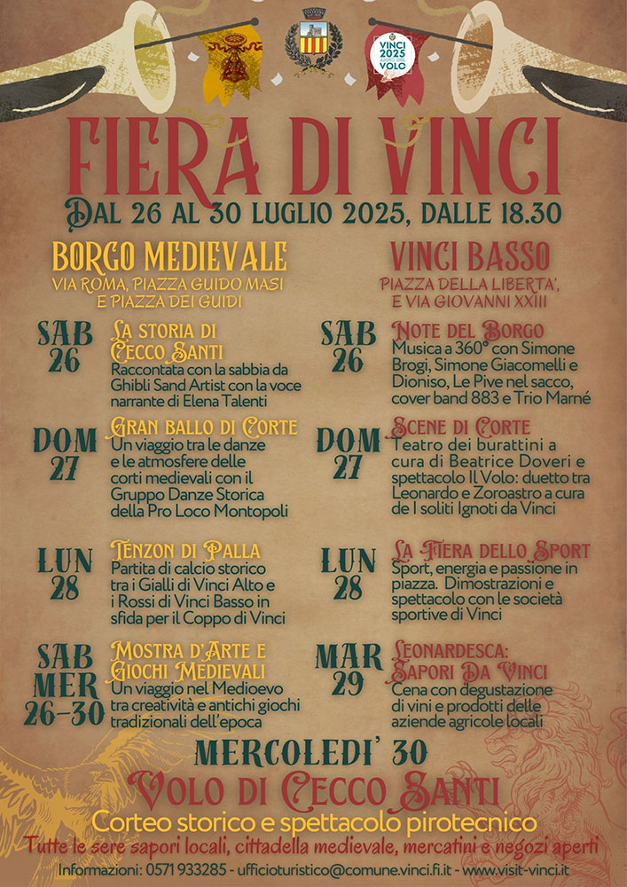 Il programma è dettagliato e unisce dal 26 al 30 luglio il borgo medievale (Via Roma, Piazza Masi e Piazza dei Conti Guidi) a Vinci Basso, ovvero la zona di Piazza della Libertà e Via Giovanni XXIII.