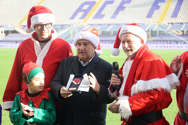 Rocco Commisso e Joe Barone da oggi sono Babbi Natale onorari. La Compagnia di Babbo Natale ha conferito loro la targa questo pomeriggio allo stadio Artemio Franchi prima del fischio d'inizio della partita Fiorentina Monaco. Tanti i Babbi scesi in campo insieme alla squadra, tutti vestiti di rosso, con barbe e cappelli per fare festa e per dare soprattutto riconoscimento all'impegno benefico svolto dalla Fiorentina durante la pandemia.