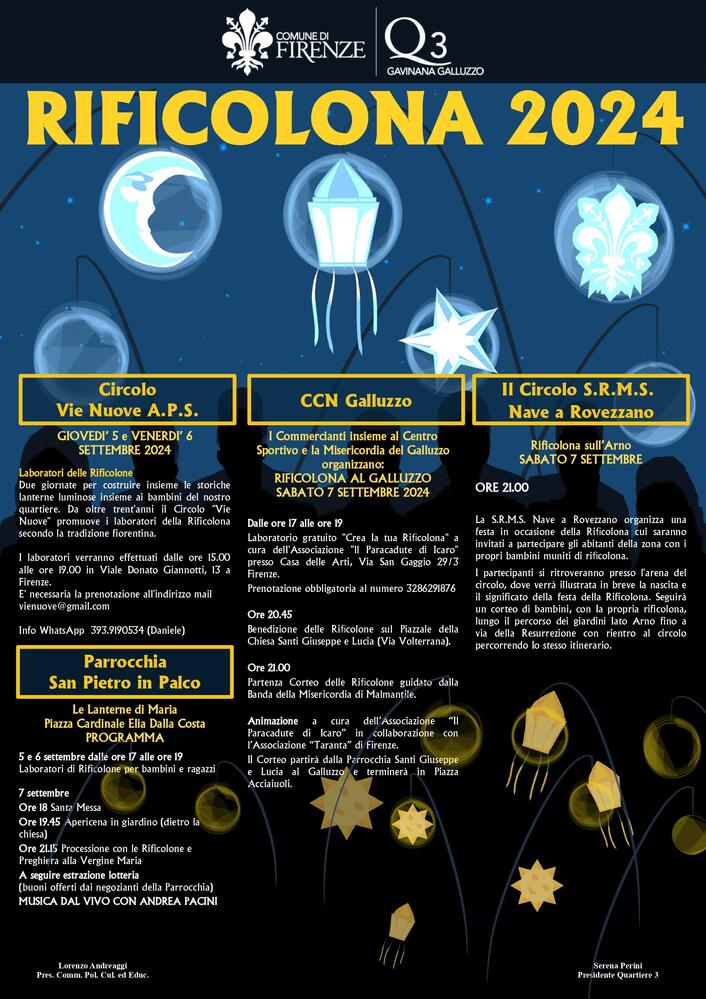 I Commercianti del Galluzzo insieme al Centro Sportivo e alla Misericordia del Galluzzo organizzano sabato 7 settembre dalle ore 17 alle 19 un laboratorio gratuito "Crea la tua Rificolona" a cura dell’Associazione “ll Paracadute di Icaro” presso Casa delle Arti, Via San Gaggio 29/3 Firenze con prenotazione obbligatoria al numero 3286291876.Alle ore 20.45 si terrà la benedizione delle Rificolone sul Piazzale della Chiesa Santi Giuseppe e Lucia (Via Volterrana), alle ore 21 partirà il corteo delle Rificolone guidato dalla Banda della Misericordia di Malmantile.Animazione a cura dell’Associazione “Il Paracadute di Icaro” in collaborazione con l’Associazione “Taranta” di Firenze. II Corteo partirà dalla Parrocchia Santi Giuseppe e Lucia al Galluzzo e terminerà in Piazza Acciaiuoli.