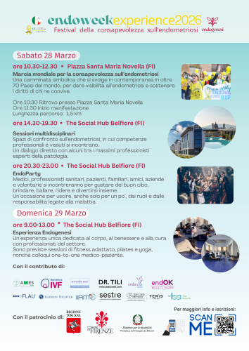 Sabato mattina la città si ritroverà in Piazza Santa Maria Novella per la Worldwide Endomarch, la marcia mondiale che unisce 70 Paesi. Il weekend proseguirà presso The Social Hub Belfiore con tavole rotonde, sessioni di pilates, yoga e tecniche di respirazione per la gestione dello stress e della riconnessione corporea.