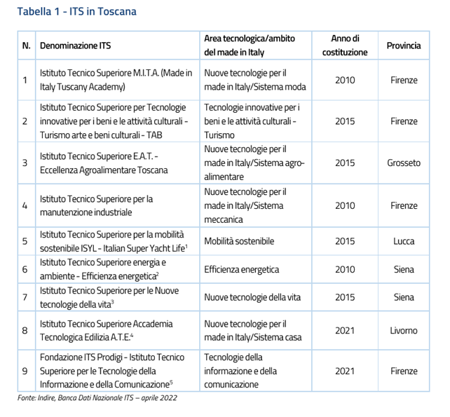 *Gli ITS sono scuole di alta tecnologiastrettamente legate alsistema produttivo. Accedono agli ITS, a seguito di selezione, i giovani e gli adulti in possesso di diploma di istruzione secondaria superiore e coloro che siano in possesso di un diploma quadriennale di istruzione e formazione professionale e che abbiano frequentato un corso annuale integrativo di istruzione e formazione tecnica superiore. In Toscana sono 9.