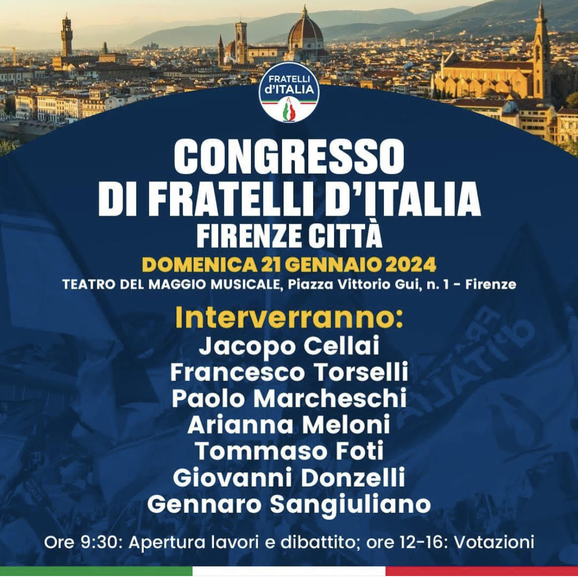 Domenica 21 Gennaio dalle ore 9.30 al Teatro Maggio Musicale Fiorentino Fratelli d'Italia procede all'elezione del coordinatore e dei membri del coordinamento. Oltre alle votazioni (riservate solo agli iscritti al partito), in programma dibattiti ed interventi aperti a tutti. Sarà un momento di confronto politico per il partito, soprattutto in vista delle prossime elezioni. Saranno presenti per l'occasione non solo gli eletti fiorentini e i parlamentari toscani, tra i quali Giovanni DONZELLI, Paolo Marcheschi e il Capogruppo alla Camera Tommaso FOTI, ma anche esponenti del Governo e del Partito a livello nazionale, come il Ministro Gennaro SANGIULIANO e Arianna MELONI.