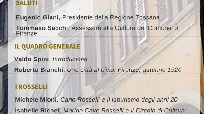 Saranno in tanti gli studiosi: Claudio Bianchi, Marino Biondi, Marina Calloni, Marco Dardi. Mimmo Franzinelli, Michele Mioni, Giuliano Pinto, Giovanna Procacci, Isabelle Richet, Sandro Rogari, Giulio Talini, che insieme al Presidente della Fondazione Circolo Rosselli, Valdo Spini e a Massimo Tarassi che ha coordinato la manifestazione, parleranno del centenario del fiorentino Circolo di Cultura. Il Circolo ebbe tra i suoi fondatori i fratelli Carlo e Nello Rosselli e Gaetano Salvemini e molti dei suoi giovani soci diventeranno illustri personalità della politica e della cultura italiane.