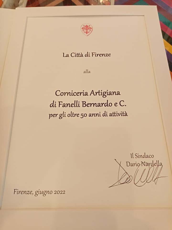 GALLUZZO (FIRENZE) - Aria di festa da "Cornici Fanelli" in piazza Acciaioli al Galluzzo: nei giorni scorsi l'assessore al Commercio e alle Attività produttive Federico Gianassi ha consegnato a nome della Città di Firenze un importante riconoscimento "per gli oltre 50 anni di attività".
