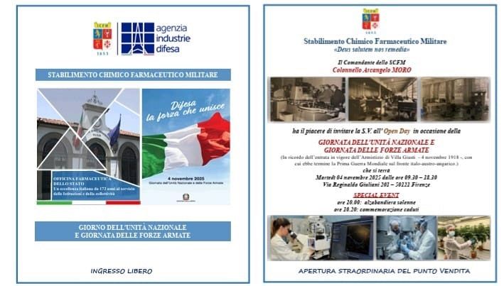 - la Caserma Guareschi, via Reginaldo Giuliani 201, sede dello Stabilimento Chimico Farmaceutico Militare: dalle ore 09.30 alle 18.30, visita di alcune aree e manufatti di interesse storico quali la Galleria della Memoria, il Nucleo Dogliotti (shelter chirurgico) ed il Locomotore Ferroviario di rifornimento e partecipazione alla cerimonia di Alzabandiera e alla deposizione di una corona di alloro al Monumento ai caduti;