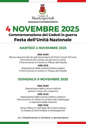 Le celebrazioni si articoleranno in due momenti distinti, che coinvolgeranno la comunità e le istituzioni locali in un percorso di memoria e partecipazione. Martedì 4 novembre 2025 alle ore 10:00 è previsto il ritrovo davanti alla Scuola Secondaria di Primo Grado “R. Fucini”, con la formazione del corteo che, insieme agli alunni, si muoverà verso il Monumento ai Caduti in Piazza del Popolo. Alle ore 10:15 avrà luogo la deposizione della corona d’alloro presso tale monumento. Il Monumento ai Caduti sito in Piazza del Popolo a Montespertoli, eretto dopo la seconda guerra mondiale, raccoglie i nomi dei militari, dei civili e dei partigiani caduti o dispersi nella zona durante i conflitti. L’opera è segnalata come bene culturale nel catalogo nazionale.