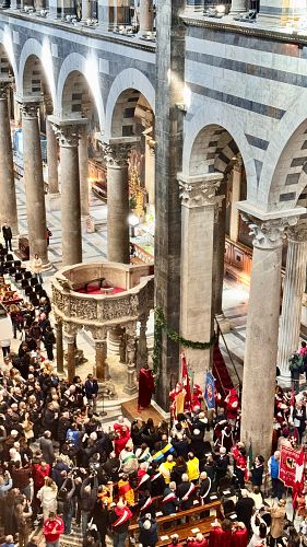«Il raggio di sole nella Cattedrale – spiega l’assessore alle tradizioni storiche, Filippo Bedini – è particolarmente significativo oggi, in una giornata inizialmente nuvolosa: lo interpretiamo come un buon auspicio per l’anno 2027 dei pisani. Allo stesso modo, è un segnale positivo la presenza, come mai prima, di tantissimi bambini e ragazzi che, fin dal palazzo comunale, ci hanno seguito in corteo fino alla Cattedrale, portando gioia ed entusiasmo. Un’esperienza che, vissuta non solo a scuola ma anche per le strade della città e nel Duomo, assume un valore diverso e più profondo.