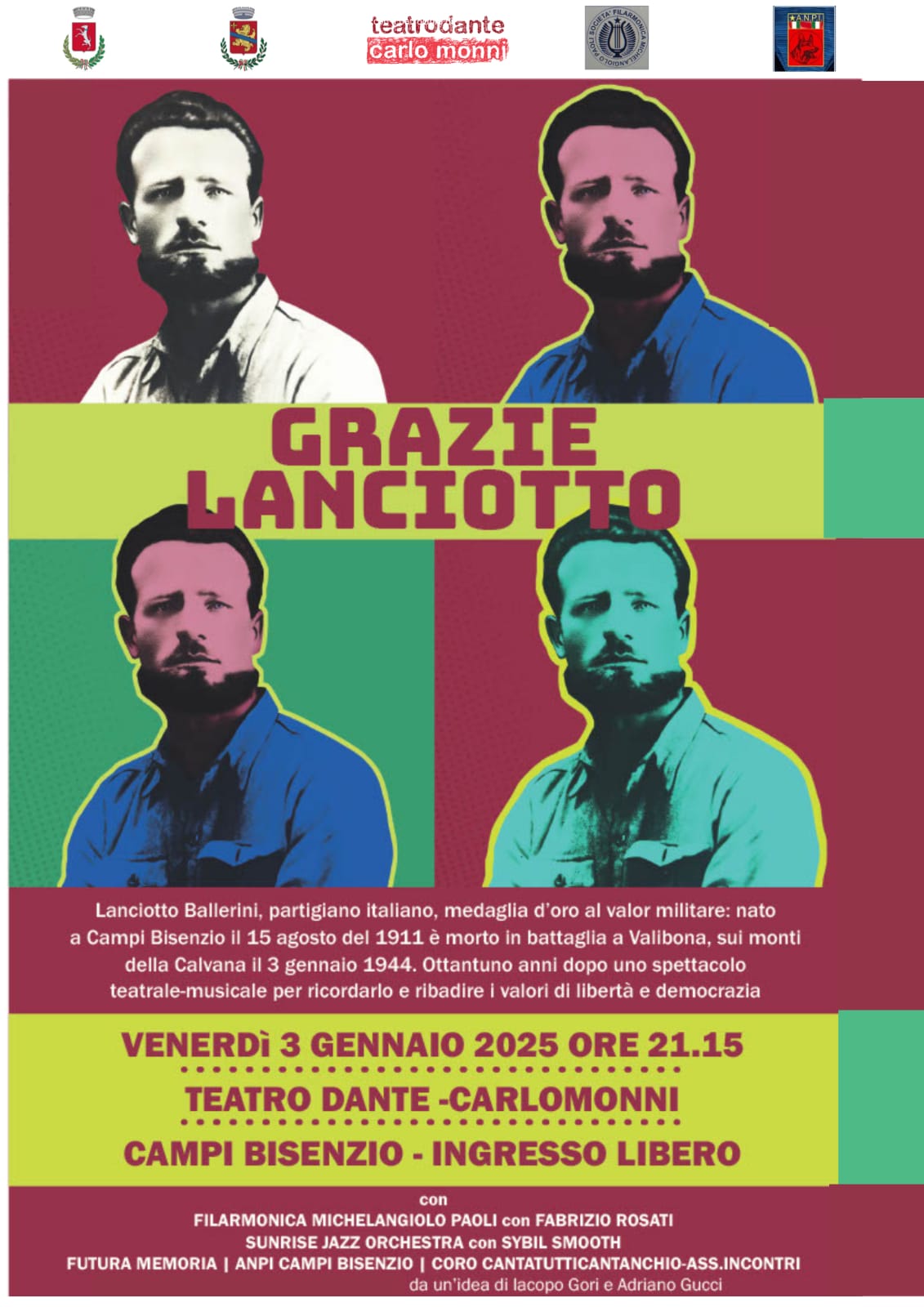 I testi dello spettacolo sono tratti dalle testimonianze dei partigiani di Lanciotto Ballerini raccolte direttamente dall’Anpi di Campi Bisenzio. Marco Pepi (Anpi) introdurrà lo spettacolo raccontando brevemente la storia di Lanciotto prima di quel 3 gennaio. Nel foyer del teatro ci sarà anche la possibilità di iscriversi alla sezione Anpi per il 2025 e si potranno acquistare libri sulla resistenza e il fumetto su Lanciotto.Lo spettacolo - oltre al sostegno dell’Anpi - ha il patrocinio dei Comuni di Campi Bisenzio e Calenzano e del Teatrodante Carlo Monni di Campi Bisenzio.