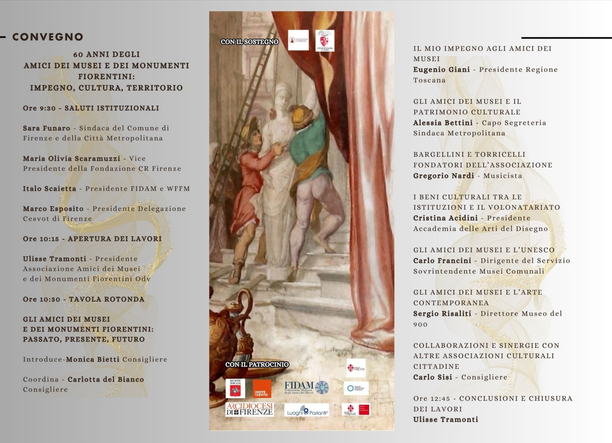 Per celebrare questo importante anniversario l’Associazione ha promosso il Convegno “60 anni degli Amici dei Musei e dei Monumenti Fiorentini – Impegno, Cultura, Territorio”, che si terrà il prossimo 20 novembre presso la Sala Luca Giordano di Palazzo Medici Riccardi a Firenze.