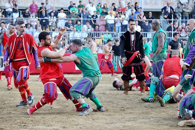 I Rossi si impongono sui Verdi per 7 cacce e mezzo a 2. Nel giorno di San Giovanni - il 24 Giugno - la formazione di Santa Maria Novella affronterà gli Azzurri per la finale del Calcio Storico 2023.