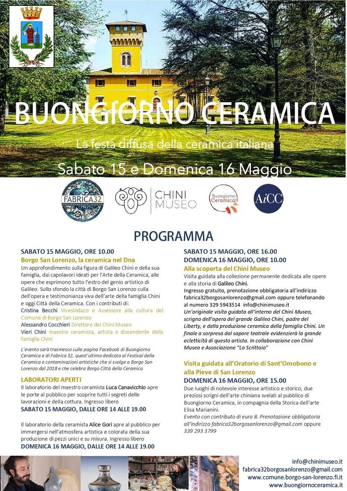 Quest’anno Buongiorno Ceramica, che segue comunque le linee guida di AICC, sarà organizzata nell’ambito di Fabrica32, Festival della Ceramica e contaminazioni artistiche del Comune di Borgo San Lorenzo che si svolge dal 2018 proprio per omaggiare Borgo Città della Ceramica e per rafforzarne il ruolo.