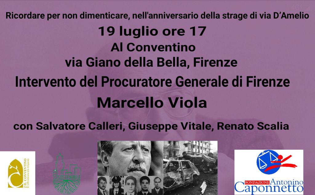 "Ricordare per non dimenticare" è il titolo dell'incontro, nell’anniversario della strage di via D’Amelio, a cura della Fondazione Caponnetto. Interviene il Procuratore Generale di Firenze Marcello Viola.
