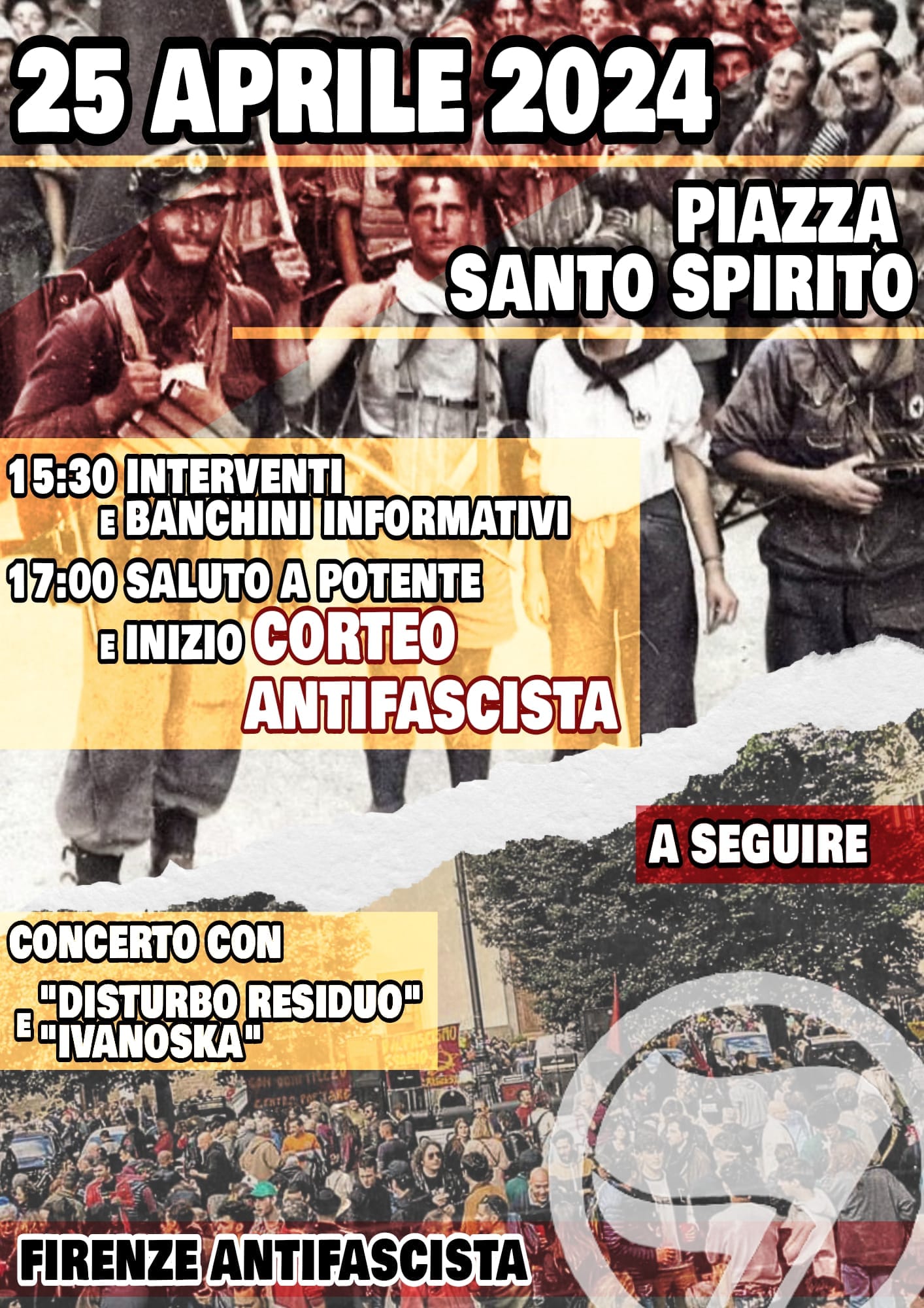 Firenze, 24.4.2024 - Sulla pagina Facebook Firenze Antifascista è pubblicizzato il corteo 25 APRILE IN PIAZZA S.SPIRITO "per sostenere le lotte e chi pratica resistenza a Firenze come altrove. Autodeterminazione e solidarietà nella piazza delle antifasciste e degli antifascisti fiorentini!".