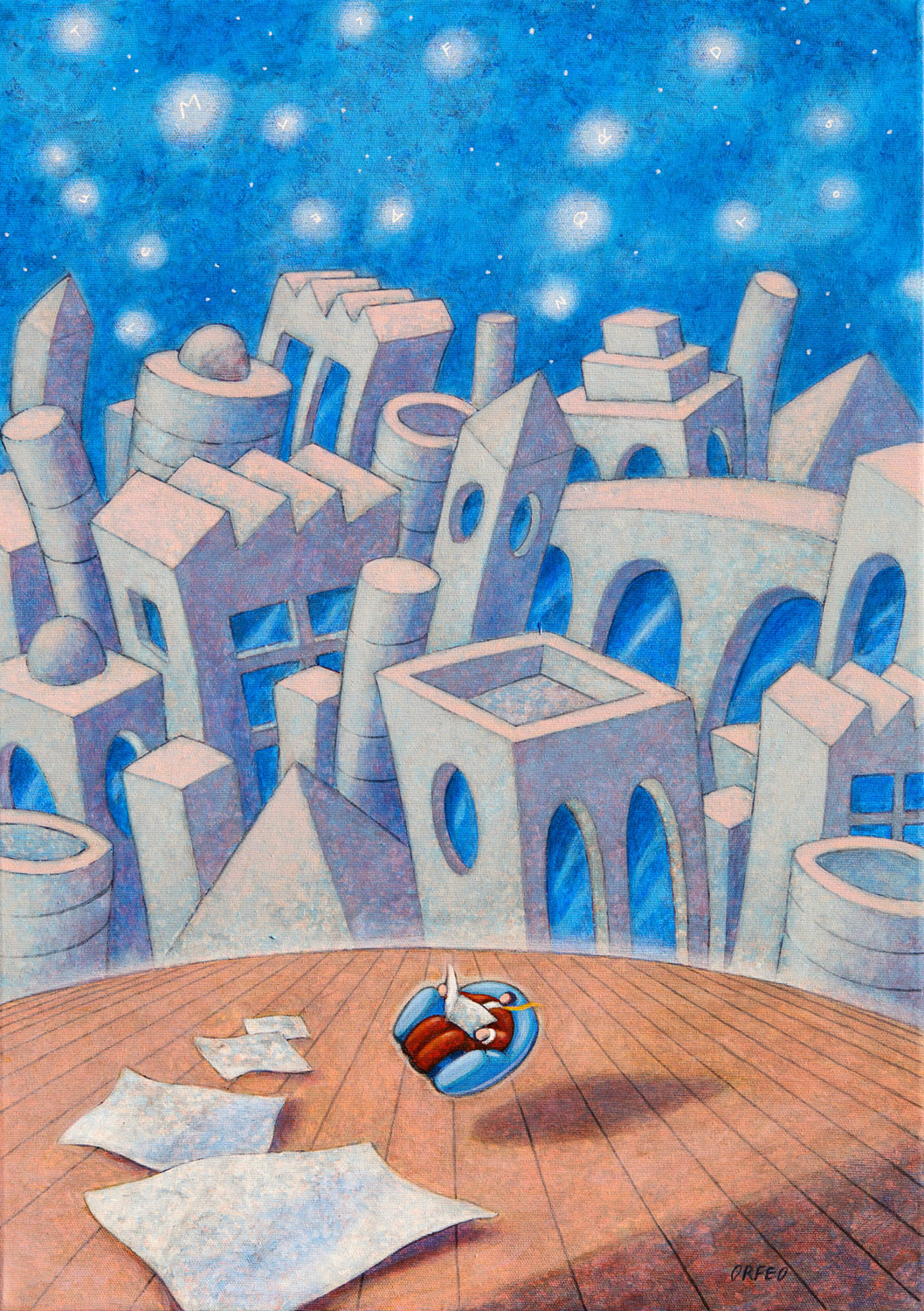 Nelle tele a olio e acrilico di Armando Orfeo (Marina di Grosseto, 1964), il ‘Signor Cozza’, stereotipo del borghese medio, attraversa singolari ambientazioni urbane e marine, perennemente esitante tra la routine e l’abbandono onirico.