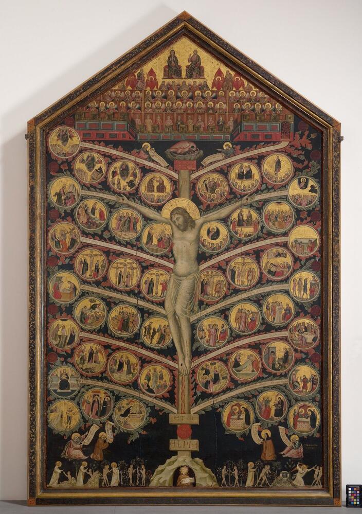 Al centro dell’opera si trova la figura di Cristo, crocifissa a un albero con dodici rami, ad ognuno sono appesi, come dei frutti, quattro medaglioni, con episodi della vita di Gesù; l’ultimo, in alto a destra, ne ha solo tre perché la scena finale è rappresentata nella sommità cuspidata del dipinto, dove il Redentore e La Vergine in trono sovrastano la schiera di santi, angeli e beati, disposti su quattro file. In basso troviamo le storie della Genesi, mentre, sul registro appena superiore, a sinistra, le storie di Mosè e San Francesco, e, a destra, quelle di Santa Chiara e San Giovanni Evangelista. L’albero si erge sopra una roccia, al cui interno si apre una caverna nella quale scorgiamo un francescano con un libro aperto in mano, si tratta con buona probabilità dell’autore del testo, san Bonaventura. È considerata una delle raffigurazioni più antiche dei temi teologico-filosofici della corrente spirituale dell’ordine.