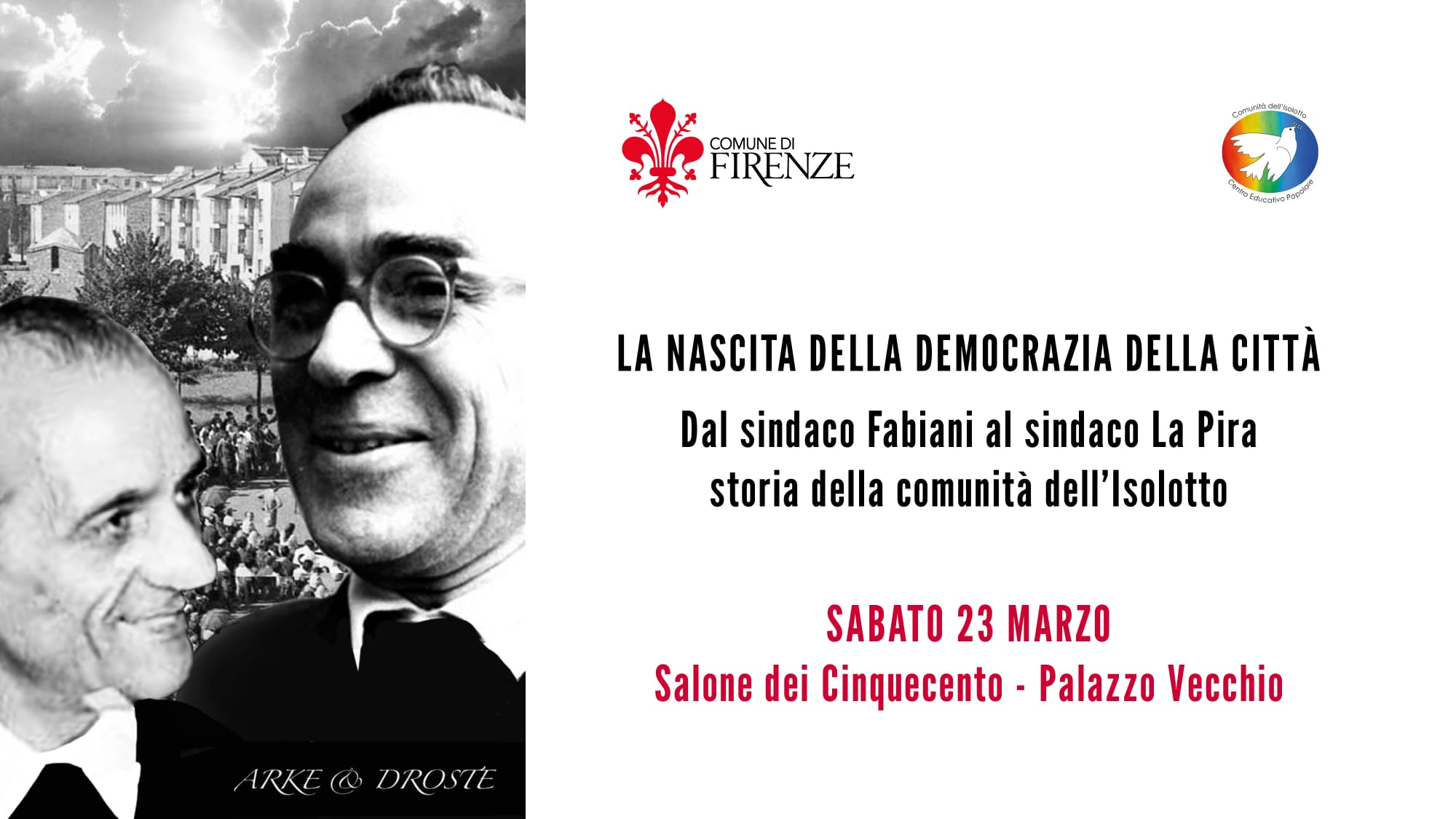 “Quest’anno ricordiamo i 50 anni dalla scomparsa di Mario Fabiani, 70 anni dalla consegna delle prime chiavi al Quartiere dell’Isolotto ed i 120 anni di Giorgio La Pira. Tra le iniziative in ricordo della nascita di questo quartiere – spiega il presidente del Consiglio comunale Luca Milani – l’iniziativa di sabato prossimo propone, attraverso un docufilm, una stagione politica e culturale per molti versi straordinaria: la Firenze da Mario Fabiani, primo sindaco dopo la Liberazione fino al sindaco Giorgio La Pira.