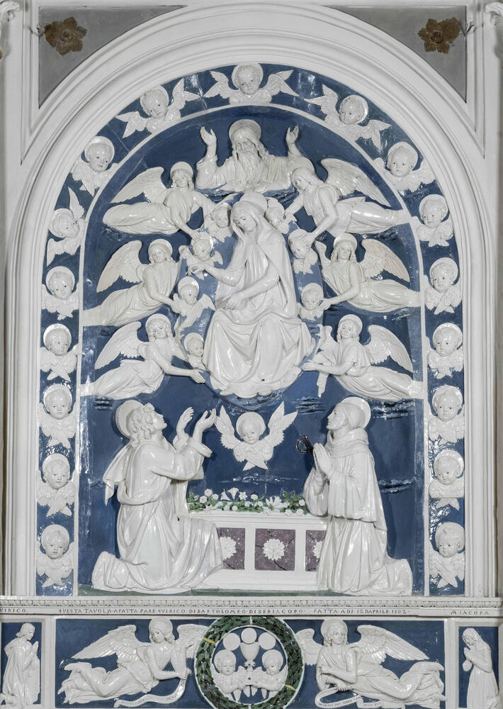 In quest’opera di grande importanza, la silhouette maestosa della Vergine Maria, sostenuta da sei angeli, appare ai Santi Tommaso e Leonardo all’interno di una mandorla di cherubini ed è incoronata dalla figura di Dio Padre, le cui braccia sono aperte in un gesto di accoglienza e protezione. È quindi profondamente significativo che la Madonna della Cintola, segnata dai tratti di una complessa storia conservativa, possa ora essere restituita alla gente di Foiano nella piena e radiosa chiarezza, grazie al generoso contributo di Fabrizio Moretti.