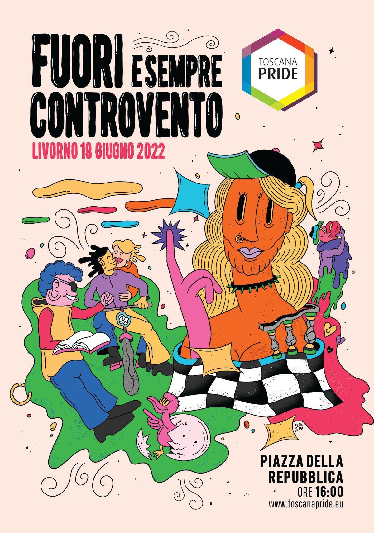 Fuori e sempre controvento è lo slogan della campagna di comunicazione del Toscana Pride 2022 la cui immagine è stata realizzata da Niro Perrone. Un claim fortemente evocativo perché richiama la ricorrenza del cinquantesimo anniversario di un evento storico avvenuto a Sanremo il 5 aprile del 1972: la prima manifestazione italiana in difesa dei diritti e della dignità delle persone omosessuali, la protesta del F.U.O.R.I (Fronte Unitario Omosessuale Rivoluzionario Italiano) passata alla Storia come la Stonewall Italiana. FUORI però è il termine utilizzato anche per indicare il ritorno nelle strade e nelle piazze, dopo due anni difficili a causa della pandemia, in cui alla lotta LGBTQIA+* sono mancati i corpi favolosi e ribelli della comunità arcobaleno. Infine, nello slogan è forte il richiamo a Livorno attraverso il riferimento al vento.